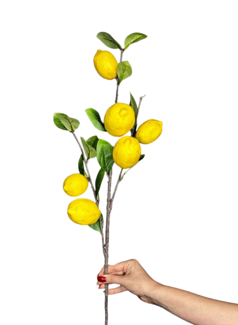 Штучна гілка лимона — це виразний декоративний елемент, який одразу додає свіжості та кольору будь-якій композиції. Насичені жовті плоди в поєднанні з зеленим листям створюють контраст, що добре працює як у мінімалістичних, так і в насичених декорах.