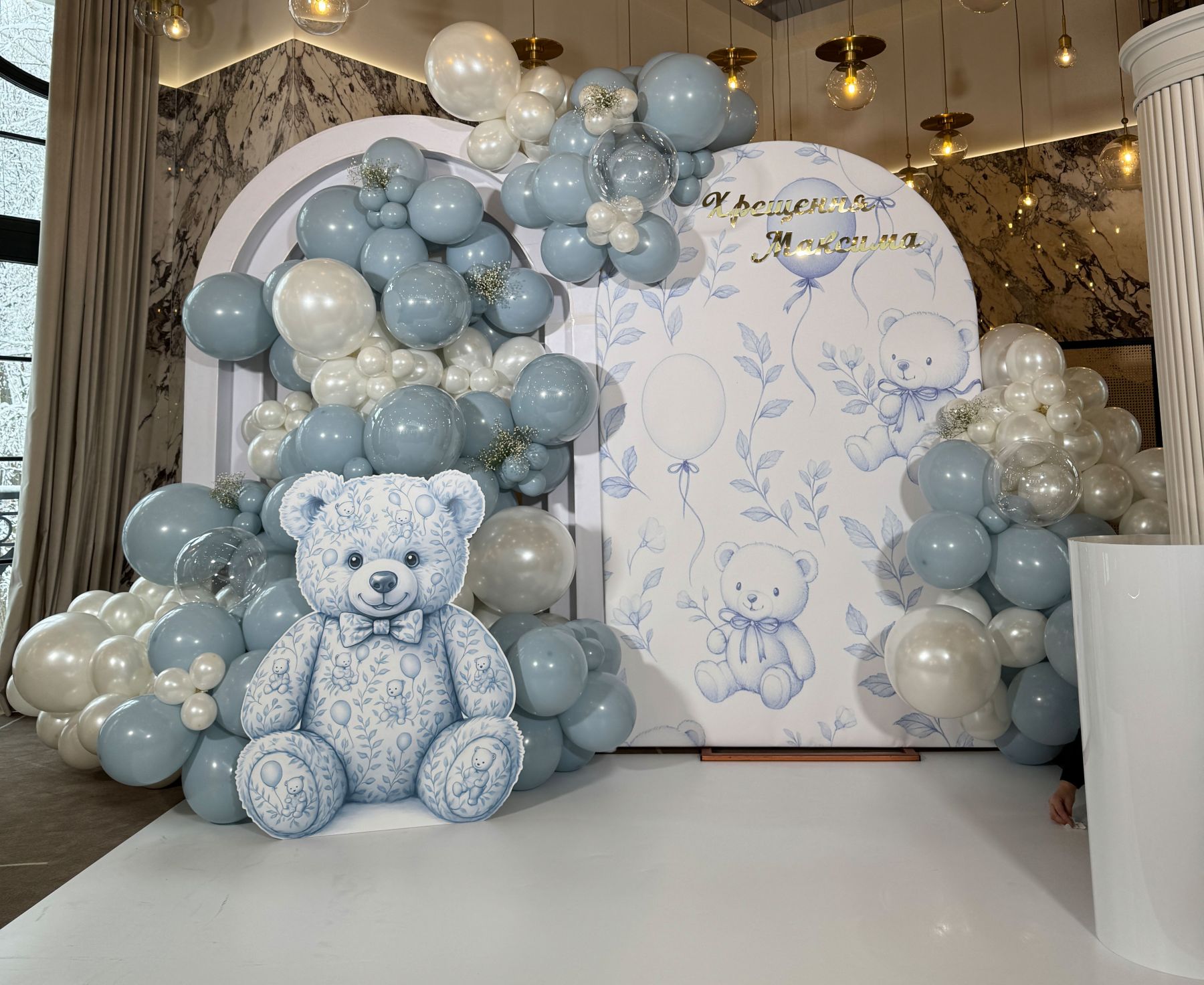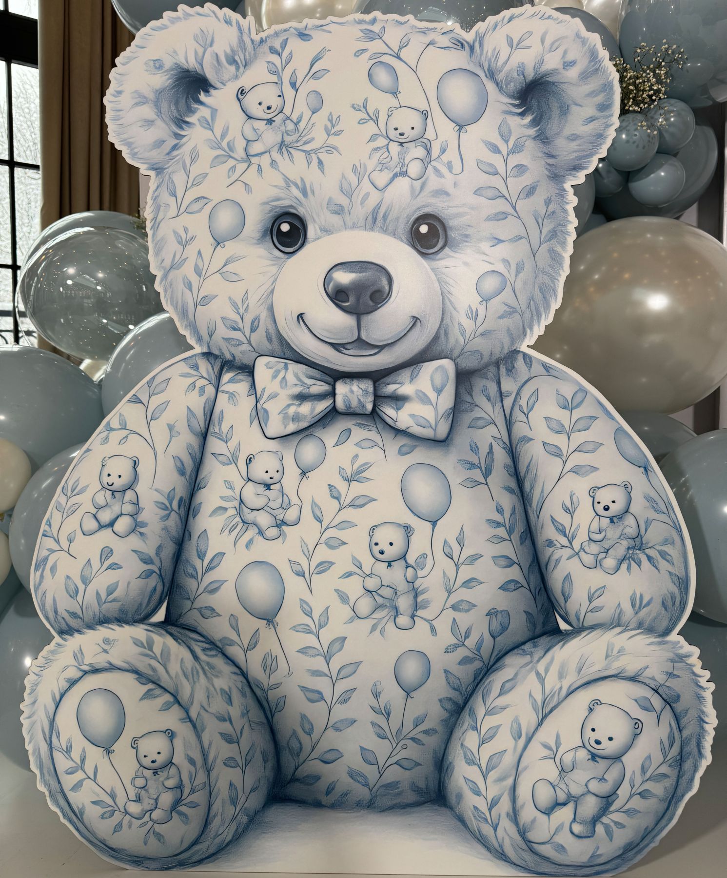 Пастельний дизайн, деталізований ілюстративний принт та якісна поверхня дозволяють легко поєднати ведмедика з кульками, арками та іншими елементами декору.