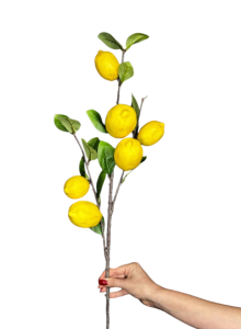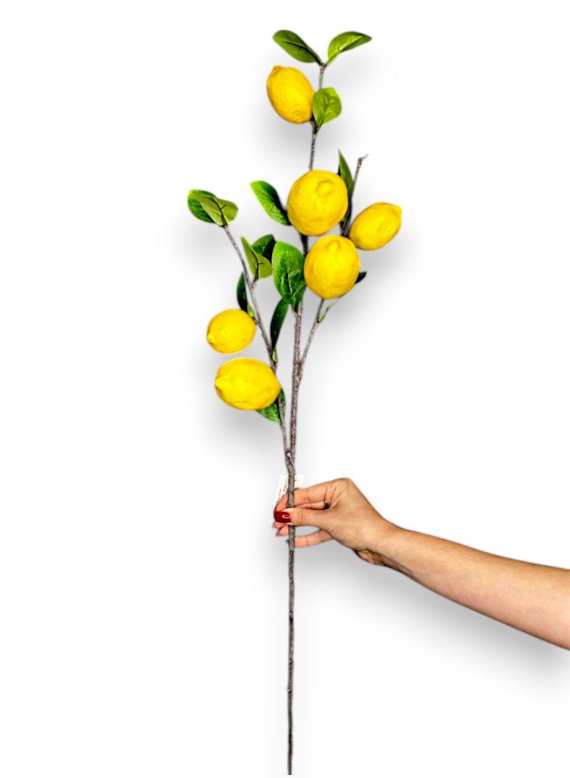 Штучна гілка лимона — це виразний декоративний елемент, який одразу додає свіжості та кольору будь-якій композиції. Насичені жовті плоди в поєднанні з зеленим листям створюють контраст, що добре працює як у мінімалістичних, так і в насичених декорах.
