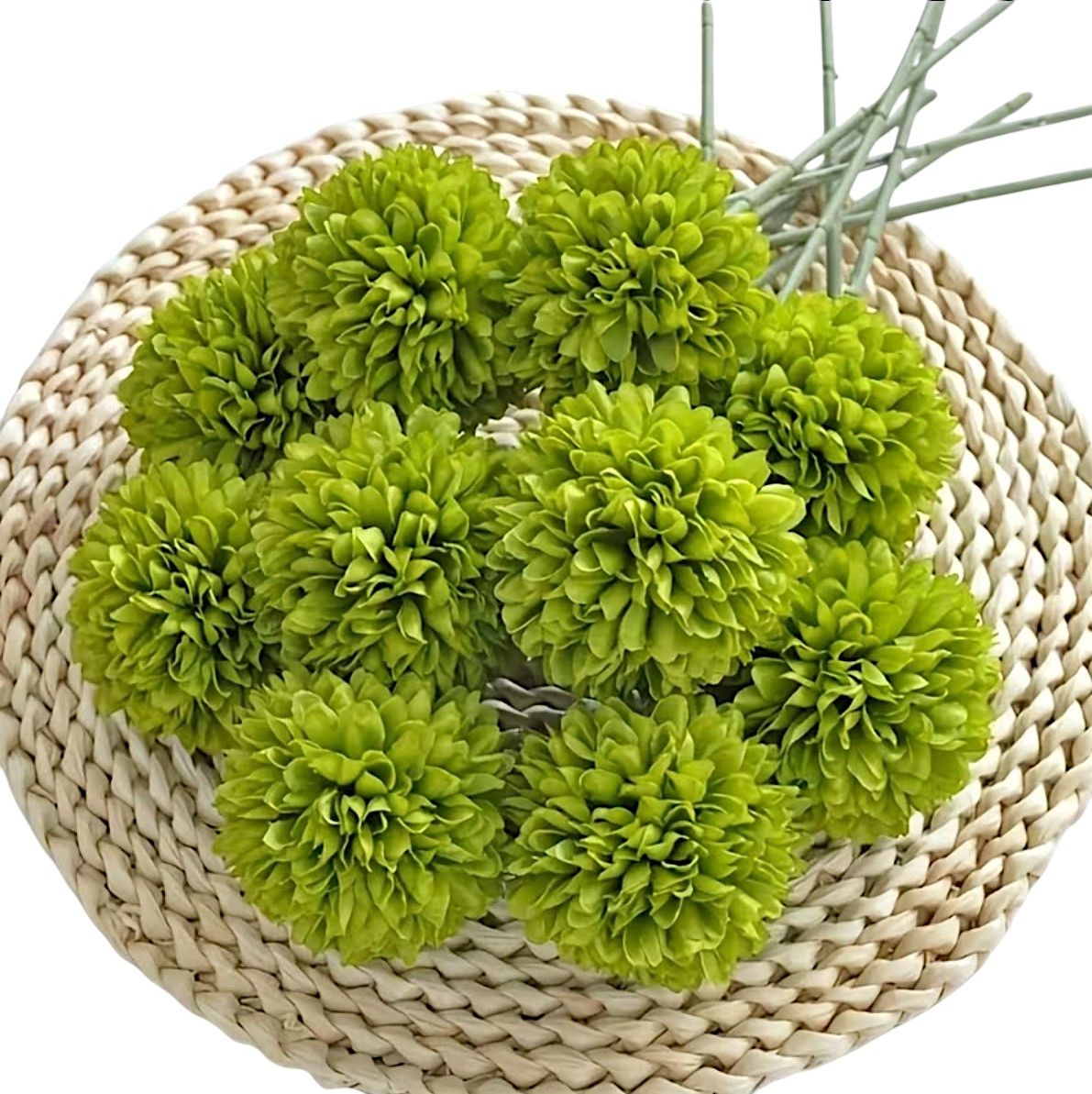 Декоративні штучні жоржини зеленого кольору — свіжий акцент для оформлення свят та фотозон.